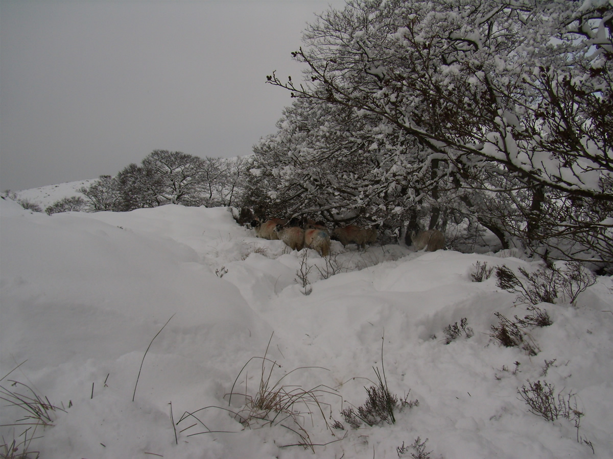 Because of the continuing severe weather conditions, this flock of Swaldale sheep have been brought down from Waters Meet on Spaunton Moor, where they had taken shelter, to be nearer Hill Top Farm where they are being fed hay and can nibble gorse and heather. Gorse has a very high protein content.